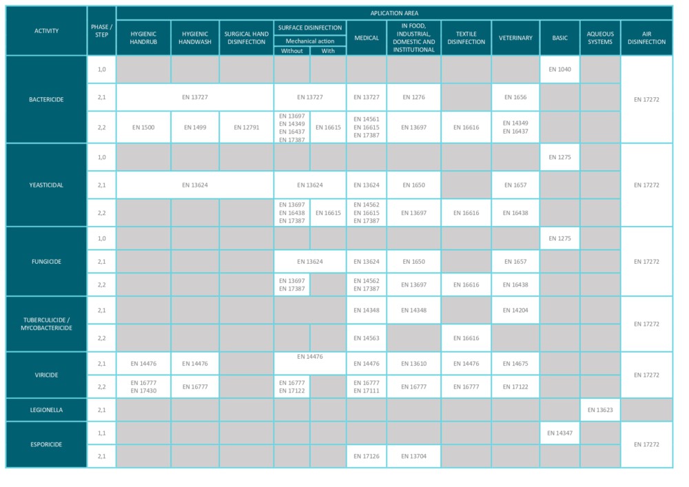 Below is a table grouping the European standards by type of antimicrobial activity and application area. This classification helps identify the appropriate standard depending on the product’s intended use: